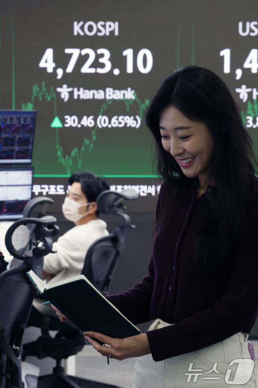 (서울=뉴스1) 이광호 기자 = 코스피 지수가 사상 처음으로 4700선을 돌파한 14일 오후 서울 중구 하나은행 본점 딜링룸 현황판에 전 거래일 대비 30.46포인트(0.65%)상승한 4,723.10을 나타내고 있다. 2026.1.14/뉴스1skitsch@news1.krCopyright ⓒ 뉴스1. All rights reserved. 무단 전재 및 재배포, AI학습 이용 금지.