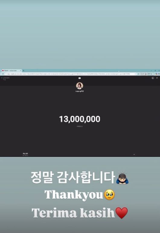 13일 쯔양은 "정말 감사합니다"라는 글과 함께 유튜버 구독자 수가 1299만9999명에서 1300만 명으로 넘어가는 순간이 담긴 영상을 공개했다.