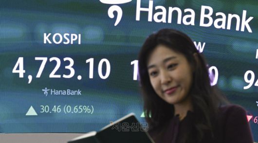 코스피가 사상 처음으로 4700선을 돌파 마감한 14일 서울 중구 하나은행 딜링룸에 코스피 지수가 표시돼 있다.