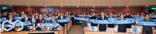 (서울=국제뉴스) 14일 오후 서울 여의도 국회 박물관에서 열린 '2026 국가균형발전 선도 영·호남 공동선포식 및 신년교류회'에서 참석자들이 퍼포먼스를 하고 있다./사진=이용우 기자