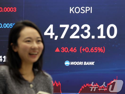 (서울=뉴스1) 황기선 기자 = 코스피 지수가 사상 처음으로 4700선을 돌파한 14일 오후 서울 중구 우리은행 본점 딜링룸 현황판에 종가가 표시되고 있다. 이날 코스피는 전 거래일 대비 30.46포인트(0.65%)상승한 4,723.10 스닥은 6.80포인트(0.72%) 내린 942.18로 장을 마쳤다. 2026.1.14/뉴스1