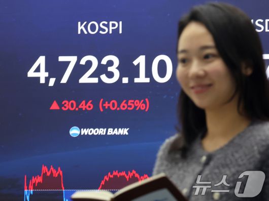 (서울=뉴스1) 황기선 기자 = 코스피 지수가 사상 처음으로 4700선을 돌파한 14일 오후 서울 중구 우리은행 본점 딜링룸 현황판에 종가가 표시되고 있다. 이날 코스피는 전 거래일 대비 30.46포인트(0.65%)상승한 4,723.10 스닥은 6.80포인트(0.72%) 내린 942.18로 장을 마쳤다. 2026.1.14/뉴스1