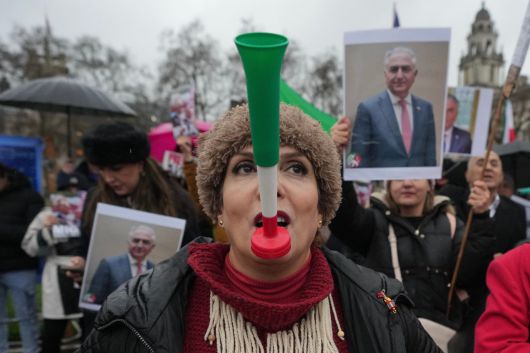 13일(현지 시간) 영국 런던 의회 건물 앞에서 시위대가 미국에 망명 중인 레자 팔라비 이란 왕세자 사진을 들고 이란 반정부 시위대에 연대하는 시위를 벌이고 있다. 2026.01.14 [런던=AP/뉴시스] |