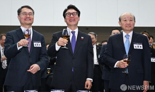[서울=뉴스핌] 정일구 기자 = 김민석 국무총리가 14일 오후 서울 강남구 한국과학기술회관에서 열린 2026 과학기술인·정보방송통신인 신년인사회에서 참석자들과 건배하고 있다. 왼쪽부터 김민수 한국과학기술단체총연합회 회장 직무대행, 김 총리, 노준형 한국정보방송통신대연합회장. 2026.01.14 mironj19@newspim.com