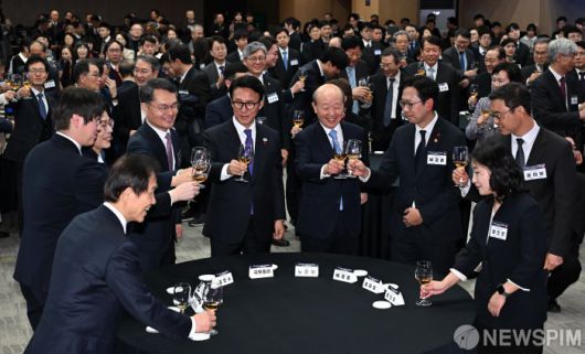 [서울=뉴스핌] 정일구 기자 = 김민석 국무총리가 14일 오후 서울 강남구 한국과학기술회관에서 열린 2026 과학기술인·정보방송통신인 신년인사회에서 참석자들과 건배하고 있다. 2026.01.14 mironj19@newspim.com