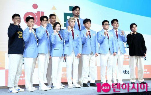 [텐아시아=조준원 기자]최창수CP, 김동욱PD, 서장훈, 안정환, 기보배, 박태환, 이형택, 하승진, 윤석민, 김영광, 김남일이 14일 서울 영등포구 페어몬트 앰배서더 서울에서 열린 JTBC 신규 예능 '예스맨' 제작발표회에 참석하고 있다.
