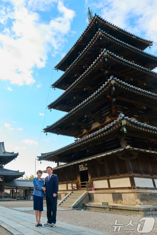 (나라(일본)=뉴스1) 이재명 기자 = 이재명 대통령과 다카이치 사나에 일본 총리가 14일 일본 나라현 호류지를 방문해 기념촬영을 하고 있다. (공동취재) 2026.1.14/뉴스12expulsion@news1.krCopyright ⓒ 뉴스1. All rights reserved. 무단 전재 및 재배포, AI학습 이용 금지.