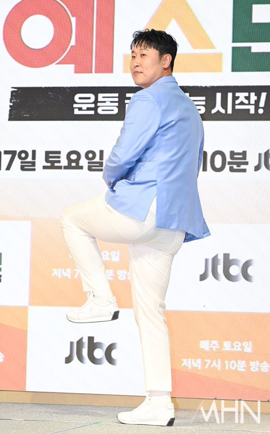 (MHN 이현지 기자) 전 야구선수 윤석민이 14일 오후 서울 영등포구 페어몬트 앰배서더 서울에서 진행된 JTBC의 신규 예능 '예스맨' 제작발표회에 참석해 포토타임을 갖고 있다.