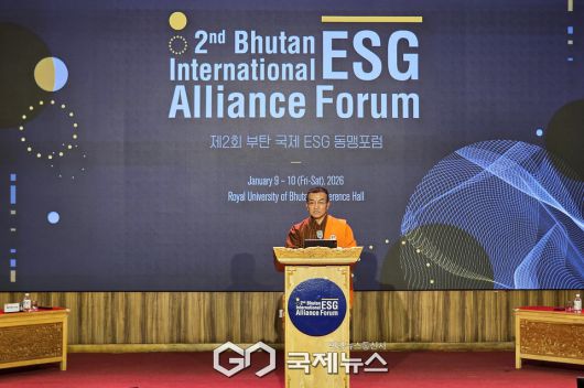 (부탄=국제뉴스) 유지현 기자 = 9일 부탄 팀푸시 부탄왕립대학교(RUB)에서 열린 제2회 부탄 국제 ESG 동맹포럼(The 2nd Bhutan International ESG Alliance Forum) 개막식에서 리키 도르지(Lyonpo Lekey Dorji) 부탄 재무장관이 축사를 했다.