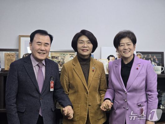 김지철 충남교육감(왼쪽)이 14일 국회를 방문해 더불어민주당 한정애 정책위의장(가운데)과 면담을 가진 뒤 사진촬영을 하고 있다. (충남교육청 제공, 재판매 및 DB금지) / 뉴스1 |