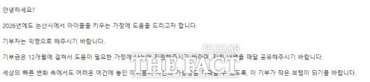 [더팩트ㅣ논산=김형중 기자] 충남 논산시에 매년 익명으로 기부를 이어온 '기부천사'가 올해도 어김없이 찾아왔다.