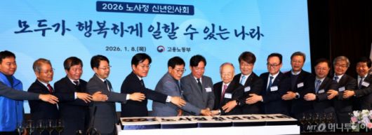 8일 오후 서울 용산구 피스앤파크 컨벤션에서 열린 2026년 노사정 신년인사회에서 한국노동조합총연맹 서종수 상임부위원장과 고용노동부 김영훈 장관, 한국경영자총협회 손경식 회장을 비롯한 내빈들이 축하떡 커팅을 하고 있다. 2026.01.08. /사진=뉴시스 |