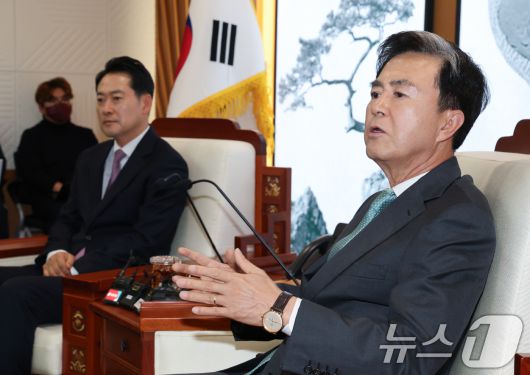 (홍성=뉴스1) 김기태 기자 = 김태흠 충남지사가 14일 오후 충남도청에서 장동혁 국민의힘 대표와 대전충남 행정통합 관련 정책협의에서 발언하고 있다. 2026.1.14/뉴스1