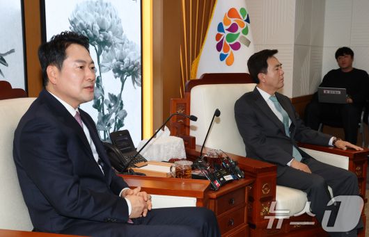 (홍성=뉴스1) 김기태 기자 = 장동혁 국민의힘 대표가 14일 오후 충남도청에서 김태흠 충남지사와 대전충남 행정통합 관련 정책협의에서 발언하고 있다. 2026.1.14/뉴스1presskt@news1.krCopyright ⓒ 뉴스1. All rights reserved. 무단 전재 및 재배포, AI학습 이용 금지.