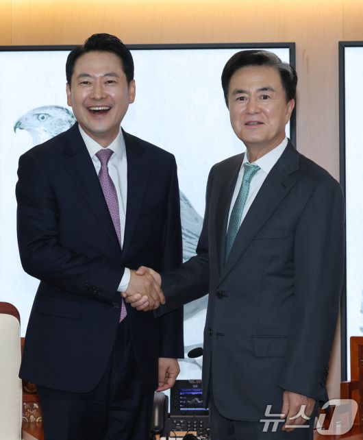 (홍성=뉴스1) 김기태 기자 = 장동혁 국민의힘 대표가 14일 오후 충남도청에서 김태흠 충남지사와 대전충남 행정통합 관련 정책협의에 앞서 악수하고 있다. 2026.1.14/뉴스1
