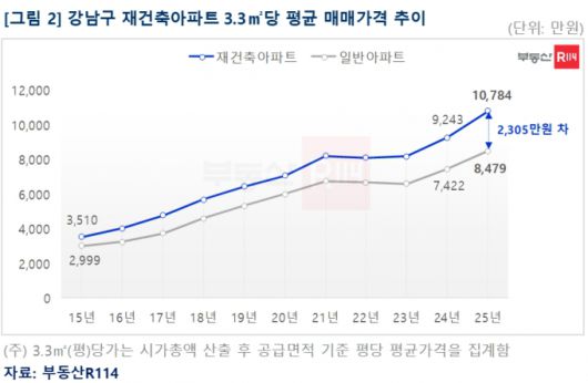 특히 송파구와 강남구는 일반 아파트보다 재건축 단지의 강세가 두드러졌다. 강남구 재건축아파트 매매가는 1년 새 24.35% 오르며 3.3㎡당 평균 1억784만원을 기록했다. 이는 전년(9243만원) 대비 1541만원 상승한 수준이다. 일반 아파트와의 가격 격차도 평당 2305만원까지 벌어졌다.