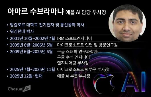 그는 2001년 IBM에서 소프트웨어 엔지니어로 경력을 시작해 2005년 MS 인턴과 방문연구원으로 활동했습니다. 2009년 구글에 연구 과학자로 합류해 2017년에는 수석 엔지니어로 승진했습니다. 2019년에는 엔지니어링 부사장으로 임명됐고 당시 AI 연구 부서인 딥마인드와 긴밀히 협력했습니다. 그는 구글의 AI 제미나이의 엔지니어링 책임자도 역임했습니다. 수브르마냐 부사장은 애플로 둥지를 옮기기 전인 2025년 7월 MS의 AI 부문 부사장으로 합류했습니다. 그는 MS의 AI 서비스 코파일럿 등의 기반 모델 작업을 담당했습니다.