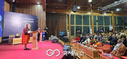 (부탄=국제뉴스) 유지현 기자 = 9일 부탄 팀푸시 부탄왕립대학교(RUB)에서 열린 제2회 부탄 국제 ESG 동맹포럼(The 2nd Bhutan International ESG Alliance Forum) 개막식에서 ㅍ이 축사를 했다.