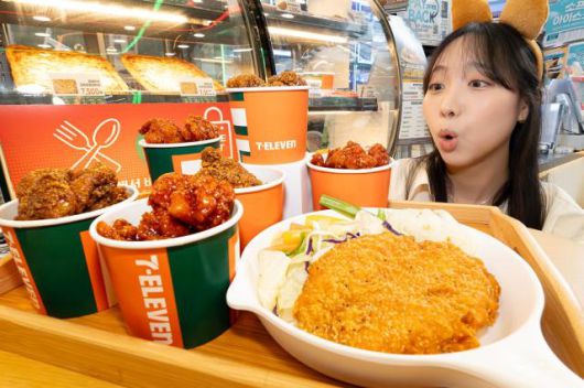 모델이 세븐일레븐 즉석식품 한도초과 지파이 등을 소개하고 있다. [사진=세븐일레븐] |