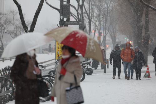 지난 12일 서울 종로구 종각역 인근에서 시민들이 눈을 맞으며 이동하고 있다. /연합뉴스 |