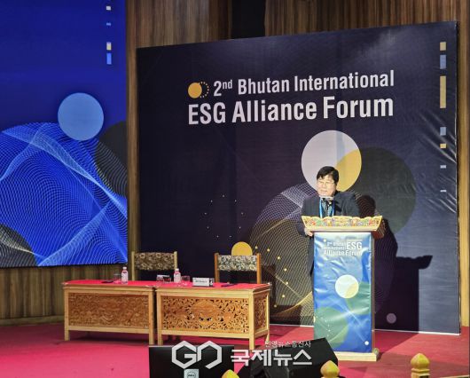 (부탄=국제뉴스) 유지현 기자 = 9일 부탄 팀푸시 부탄왕립대학교(RUB)에서 열린 제2회 부탄 국제 ESG 동맹포럼(The 2nd Bhutan International ESG Alliance Forum)에서 서울특별시 120다산콜재단 이이재 이사장(왼쪽)이 부탄 SELWA의 Peldon Tshering 사무국장에게 정보화 도서관을 기증하며 소감을 밝히고 있다.