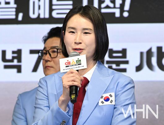 (MHN 이현지 기자) 양궁선수 기보배가 14일 오후 서울 영등포구 페어몬트 앰배서더 서울에서 진행된 JTBC의 신규 예능 '예스맨' 제작발표회에 참석해 인사말을 하고 있다.