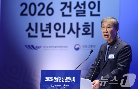 (서울=뉴스1) 김명섭 기자 = 한승구 대한건설단체총연합회장이 14일 오후 서울 강남구 건설회관에서 열린 2026 건설인 신년인사회에서 신년사를 하고 있다. 2026.1.14/뉴스1msiron@news1.krCopyright ⓒ 뉴스1. All rights reserved. 무단 전재 및 재배포, AI학습 이용 금지.