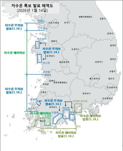 전라남도는 14일 오전 10시 서부 해역(영광~신안)과 내만 해역(함평만·득량만·여자만·가막만)에 저수온 주의보가 발령돼 양식어류 피해가 우려됨에 따라 양식어가에 수온 모니터링, 보온시설 가동 등 관리 철저를 당부했다.