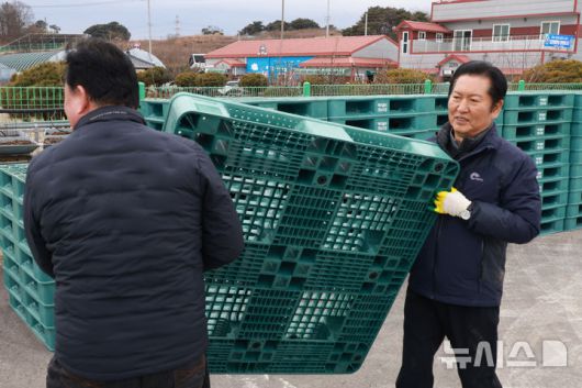 [당진=뉴시스] 고승민 기자 = 정청래 더불어민주당 대표가 14일 충남 당진 백석올미마을기업을 방문, 파레트를 옮기는 작업을 하고 있다. 2026.01.14. kkssmm99@newsis.com |