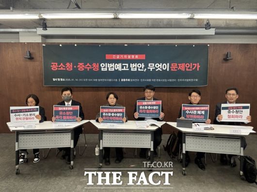 [더팩트ㅣ이라진 기자] 시민사회단체가 국무총리실 산하 검찰개혁추진단이 지난 12일 입법예고한 중대범죄수사청(중수청)과 공소청 설치 법안 철회를 촉구하며 국회가 법안을 대폭 수정해야 한다고 주장했다.
