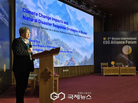 (부탄=국제뉴스) 유지현 기자 = 9일 부탄 팀푸시 부탄왕립대학교(RUB)에서 열린 제2회 부탄 국제 ESG 동맹포럼(The 2nd Bhutan International ESG Alliance Forum)에서 유희동 연세대학교 특임교수(전 기상청장)이 '부탄의 기후변화 영향과 대응 전략'을 주제로 기조강연을 했다.