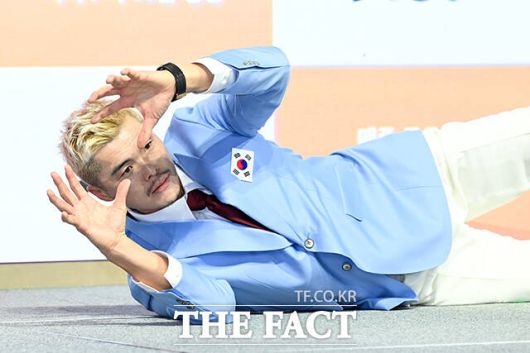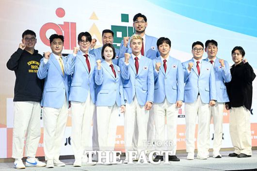 [더팩트ㅣ서예원 기자] 방송인 안정환과 수영선수 박태환, 방송인 서장훈, 양궁선수 기보배, 농구선수 하승진, 축구선수 김영광, 테니스선수 이형택, 야구선수 윤석민(왼쪽부터)이 14일 오후 서울 영등포구 페어몬트 앰배서더 서울 그랜드볼룸에서 열린 JTBC 새 예능프로그램 '예스맨' 제작발표회에 참석해 포즈를 취하고 있다.