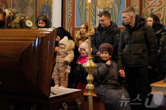 12일(현지시간) 우크라이나 키이우의 성 미하일 황금돔 수도원에서 열린 장례식에서 러시아 공격으로 사망한 의료진 세르기 스몰랴크의 관 앞에서 그의 유족과 지인들이 애도하고 있다. 2026.01.12 ⓒ AFP=뉴스1 ⓒ News1 김지완 기자 |