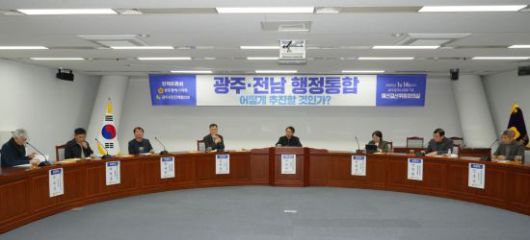 14일 오후 광주광역시의회에서 열린 ‘광주·전남 행정통합, 어떻게 추진할 것인가?’ 정책토론회에서 참석자들이 행정통합 추진 방향과 과제를 놓고 토론하고 있다. 광주시의회 제공 |