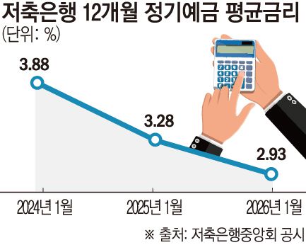 14일 저축은행중앙회 공시에 따르면 전국 79개 저축은행의 1년 만기 정기예금 평균 금리는 연 2.93%로 집계됐다. 전년(연 3.28%) 대비 0.35%포인트(p) 낮고, 2024년과 비교하면 0.95%p 하락한 수준이다.