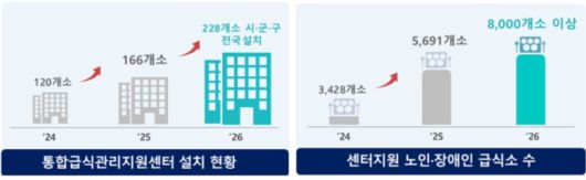 어린이에 이어 노인·장애인을 대상으로 한 급식 위생 등도 지원한다. 식약처는 영양사 없이 운영되는 50인 미만 경로당, 노인요양시설, 장애인거주시설 등의 급식 안전과 영양 관리를 위해 소규모 노인·장애인 사회복지시설을 관리하는 '통합급식관리지원센터' 62개소를 추가 설치한다.