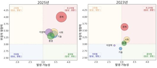 특히 경제 리스크는 부정적 영향력과 발생 가능성이 모두 3점 이상인 '초고위험 구간'으로 이동하며, 5대 리스크 중 2년 내 발생 가능성이 가장 큰 것으로 조사됐다. 2년 전 상대적으로 저위험 구간에 속했던 지정학 리스크와 기술 리스크 역시 이번 조사에서 초고위험 구간에 새롭게 진입했다.