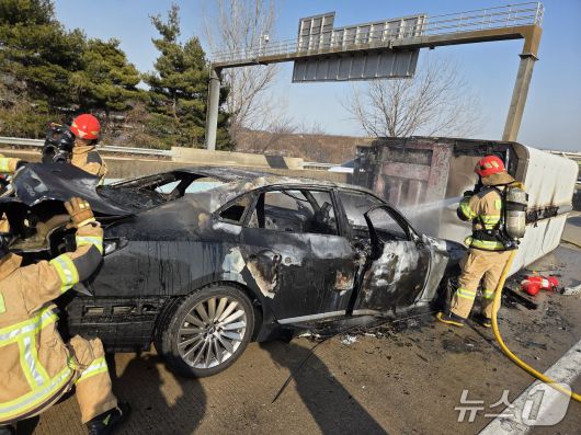 14일 오후 1시 11분쯤 창원시 의창구 동읍 남해고속도로 부산 방향 동창원 나들목 부근에서 3중 추돌사고로 차량 화재가 발생해 소방관들이 진화에 나서고 있다.(창원소방본부 제공. 재판매 및 DB금지) |
