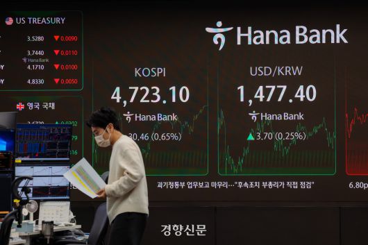 코스피가 사상 처음으로 4700선을 돌파하며 4723.1 포인트로 거래를 마감한 14일 서울 중구 하나은행 본점 딜링룸 현황판에 각종 지수가 표시되고 있다. 올해 들어 이날까지 코스피는 9거래일 연속 상승 행진을 달렸다. 이준헌 기자 |