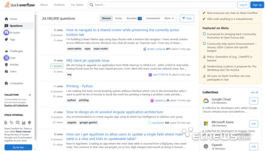 누적 2418만건 이상 게시물이 있는 글로벌 개발자 커뮤니티 '스택오버플로우' 메인화면. |