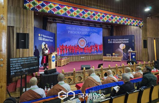 (부탄=국제뉴스) 유지현 기자 = 10일 부탄 팀푸시 부탄왕립대학교(RUB)에서 열린 제2회 부탄 국제 ESG 동맹포럼(The 2nd Bhutan International ESG Alliance Forum) 2일차 행사에서 Dasho Tashi Dorji 데수웅 스킬링 프로그램(DSP) 의장 겸 겔레푸마인드풀니스시티(GMC) 영적책임자가 데수웅 스킬링 프로그램을 주제로 발표했다.