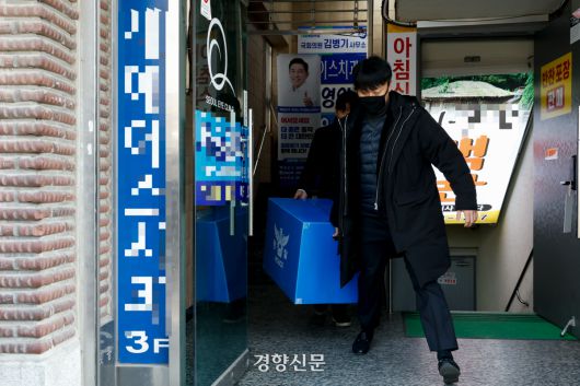 경찰이 김병기 더불어민주당 의원의 공천헌금 수수 등 각종 비위 의혹에 대한 자택, 의원실, 지역구 사무실 등을 압수수색한 14일 서울 동작구 김 의원 지역구 사무실에서 수사관들이 압수물을 들고 이동하고 있다. 문재원 기자 |