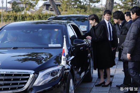 이재명 대통령이 14일 일본 나라현 사찰 호류지에서 다카이치 사나에 일본 총리의 영송을 받으며 떠나고 있다. 2026.1.14. 송은석 기자 silverstone@donga.com |