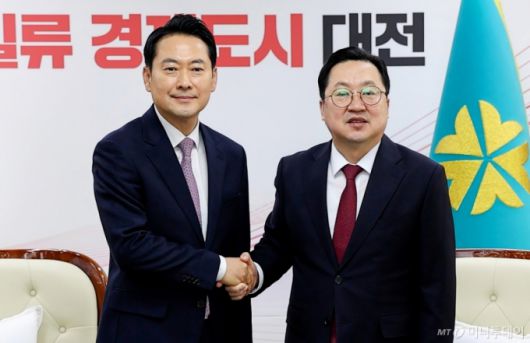 (대전=뉴스1) = 장동혁 국민의힘 대표가 14일 오전 대전시청에서 이장우 시장과 대전충남 행정통합 관련 정책협의에 앞서 악수하고 있다.(공동취재) 2026.1.14/뉴스1 Copyright (C) 뉴스1. All rights reserved. 무단 전재 및 재배포, AI학습 이용 금지. /사진=(대전=뉴스1) |