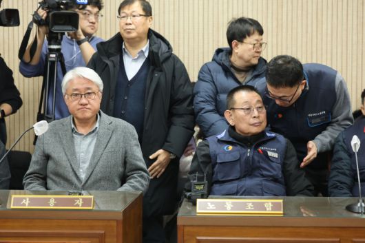 14일 서울 영등포구 서울지방노동위원회에서 열린 특별조정위원회 2차 사후 조정회의에 박점곤 서울시버스노동조합 위원장과 사측인 김정환 서울시버스운송사업조합 이사장이 노사 대표로 참석해 있다. 연합뉴스