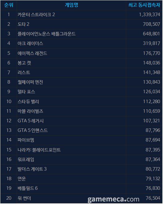 ▲ 1월 14일 오후 3시 기준 스팀 일 최고 동시접속자 TOP 20 (자료출처: 스팀) |
