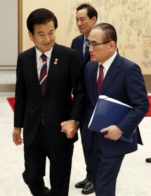 [서울=뉴시스] 최동준 기자 = 정동영(왼쪽) 통일부 장관과 위성락 국가안보실장이 28일 서울 용산 대통령실 청사에서 열린 신임 국무위원 및 국세청장 임명장 수여식에서 대화하고 있다. (대통령실통신사진기자단) 2025.07.28. photocdj@newsis.com /사진= |