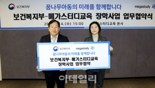 보건복지부는 14일 서울 서초구 메가스터디교육 본사에서 메가스터디교육과 아동양육시설, 공동생활가정, 위탁가정 등에서 생활 중인 보호대상아동을 위한 장학사업 추진 업무협약(MOU)을 체결했다고 밝혔다.