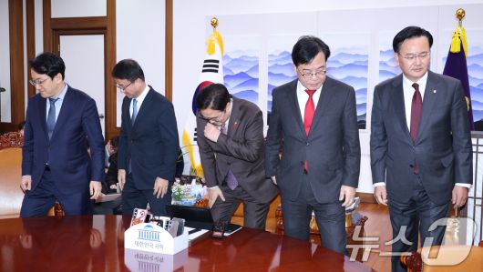 (서울=뉴스1) 신웅수 기자 = 우원식 국회의장(가운데)과 한병도 더불어민주당 원내대표, 송언석 국민의힘 원내대표가 14일 서울 여의도 국회 의장실에서 열린 여야 원내대표 회동에서 기념촬영을 마친 후 각자 자리로 돌아가고 있다. 2026.1.14/뉴스1