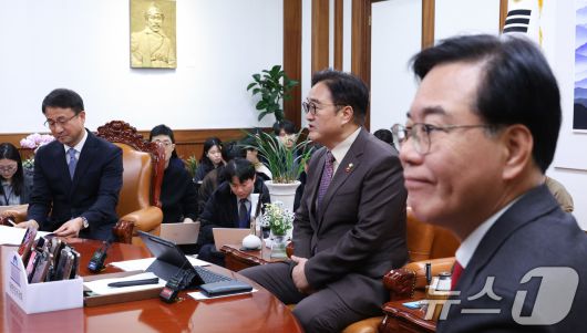 (서울=뉴스1) 신웅수 기자 = 우원식 국회의장(가운데)과 한병도 더불어민주당 원내대표(왼쪽), 송언석 국민의힘 원내대표가 14일 서울 여의도 국회 의장실에서 여야 원내대표 회동을 하고 있다. 2026.1.14/뉴스1phonalist@news1.krCopyright ⓒ 뉴스1. All rights reserved. 무단 전재 및 재배포, AI학습 이용 금지.
